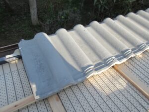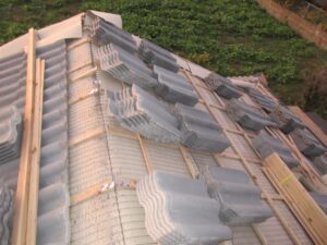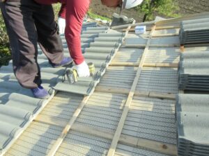 こちらの写真では、野地板、防水シートを設置した上に、瓦を引っ掛ける「桟木」と呼ばれる木材を設置し、そこに瓦を一枚ずつ固定しています。