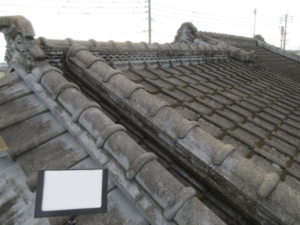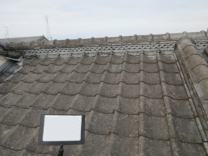 瓦同士の隙間には苔や藻のようなものがびっしりと繁殖しています。